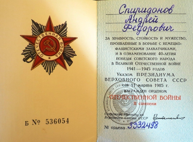 С 22.06.1941 по 06.07.1944 воевал на Ленинградском фронте, где в 1941 году познакомился с моей матерью Ивановой Верой Александровной, служащей телефонисткой в 577 гаубичном артполку. Вместе служили. В 1943 году родился я (Спиридонов Аркадий Андреевич) в блокадном Ленинграде.