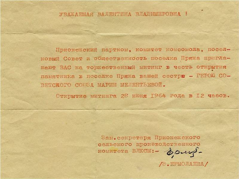 Нам удалось отыскать Зинаиду Константиновну Ермолаеву, которая подписала приглашение. Вот что она нам рассказала: «Мы работали на общественных началах и в один из комсомольских субботников решили собрать деньги для того, чтобы в Пряже установили памятник М.В. Мелентьевой. Деньги мы собирали за счет сбора золы, концертов, на которых мы выступали и многих других вещей. Наш девиз, под которым мы жили, был такой «Раньше думай о Родине, потом о себе». Незадолго до открытия памятника в марте 1964 года я была избрана заместителем секретаря Прионежского сельского производственного комитете ВЛКСМ.
