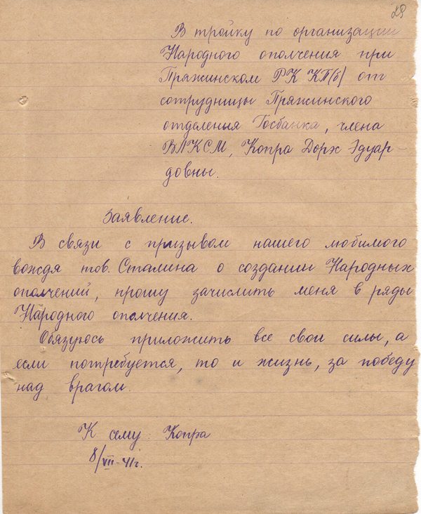 Вот как вспоминает об этом школьная подруга Марии Евдокия Шанава (Велеславова): «Когда началась война, мы с Марийкой собрались со своими товарищами по школе: Зоя Акимова, Дора Копра, Степан Ласточкин, Вася Саввоев, Игорь Попов, Саша Колодин и решили пойти добровольно на фронт. Мальчишек, конечно, сразу взяли, а нас отправили домой. Потом в августе мы с ней пошли ещё раз в райвоенкомат и все же нас определили ‒ меня при школе в госпиталь 2213, а Марийку направили в медсанбат в Эссойлу». Девушки были настойчивы: отказали в военкомате, они идут в райком партии и просятся в народное ополчение. Вот заявления Доры Копра и Зои Акимовой, школьных подруг Марийки, с просьбой зачислить их в ополчение.