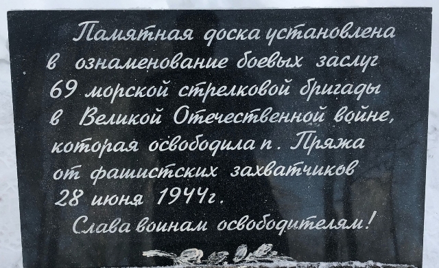 22 августа 2001 года в Пряже установлена памятная доска, увековечившая боевые заслуги 69 отдельной Печенгской Краснознаменной Морской стрелковой бригады при освобождении Пряжи от фашистских захватчиков в июне 1944 года. Мраморная плита установлена в сквере рядом с Братской могилой воинов, погибших в годы Великой Отечественной войны. Место выбрано неслучайно. Именно здесь проходят митинги, посвященные Дню Победы 9 мая и Дню освобождения Пряжи 30 июня.