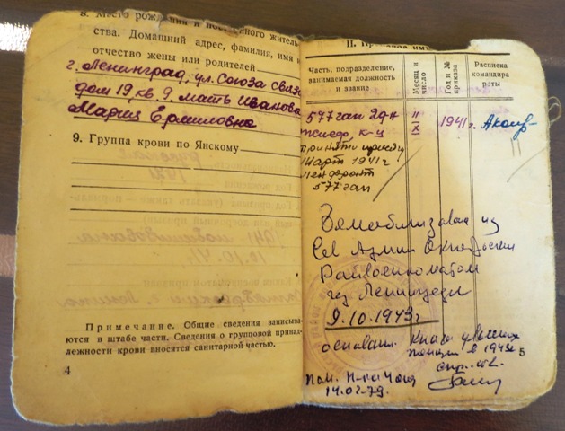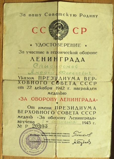 С 22.06.1941 по 06.07.1944 воевал на Ленинградском фронте, где в 1941 году познакомился с моей матерью Ивановой Верой Александровной, служащей телефонисткой в 577 гаубичном артполку. Вместе служили. В 1943 году родился я (Спиридонов Аркадий Андреевич) в блокадном Ленинграде.