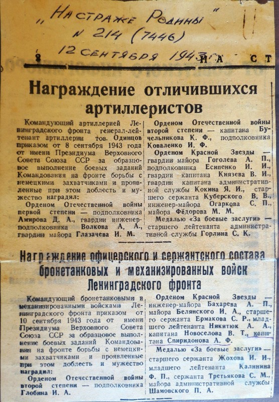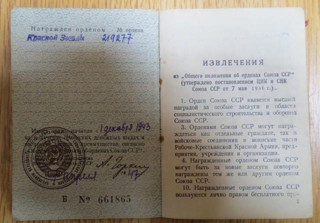 10 сентября 1943 года отец награжден орденом Красной Звезды.