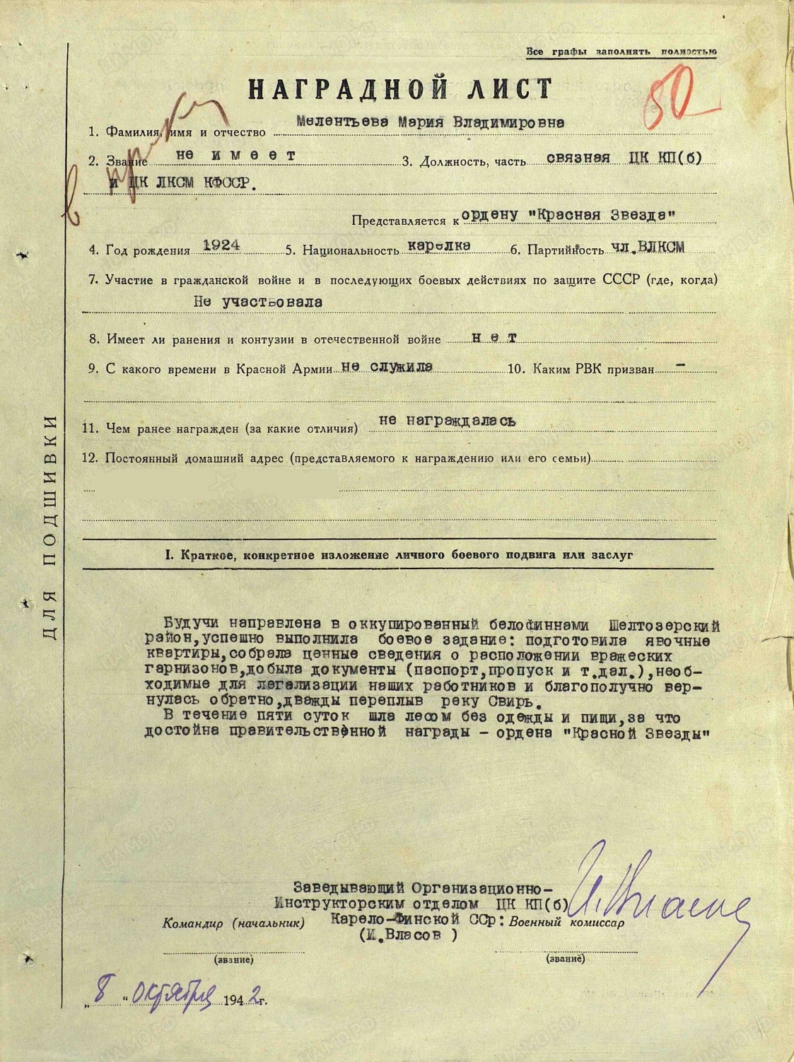 15 июня 1942 года Мария Мелентьева и её товарищ по разведшколе Анна Лисицына были направлены в оккупированный финнами Шелтозерский район для выполнения боевого задания. Им было приказано: доставить рацию подпольщикам; создать две явочные квартиры; добыть для ЦК партии республики чистые бланки финских паспортов и пропусков; собрать разведданные о войсковых частях противника и расположении военных объектов; провести беседы с население и рассказать об истинном положении на фронтах; собрать данные о людях, которые сотрудничали с финнами.