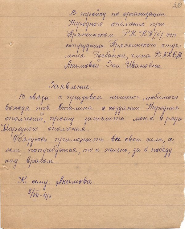 Вот как вспоминает об этом школьная подруга Марии Евдокия Шанава (Велеславова): «Когда началась война, мы с Марийкой собрались со своими товарищами по школе: Зоя Акимова, Дора Копра, Степан Ласточкин, Вася Саввоев, Игорь Попов, Саша Колодин и решили пойти добровольно на фронт. Мальчишек, конечно, сразу взяли, а нас отправили домой. Потом в августе мы с ней пошли ещё раз в райвоенкомат и все же нас определили ‒ меня при школе в госпиталь 2213, а Марийку направили в медсанбат в Эссойлу». Девушки были настойчивы: отказали в военкомате, они идут в райком партии и просятся в народное ополчение. Вот заявления Доры Копра и Зои Акимовой, школьных подруг Марийки, с просьбой зачислить их в ополчение.