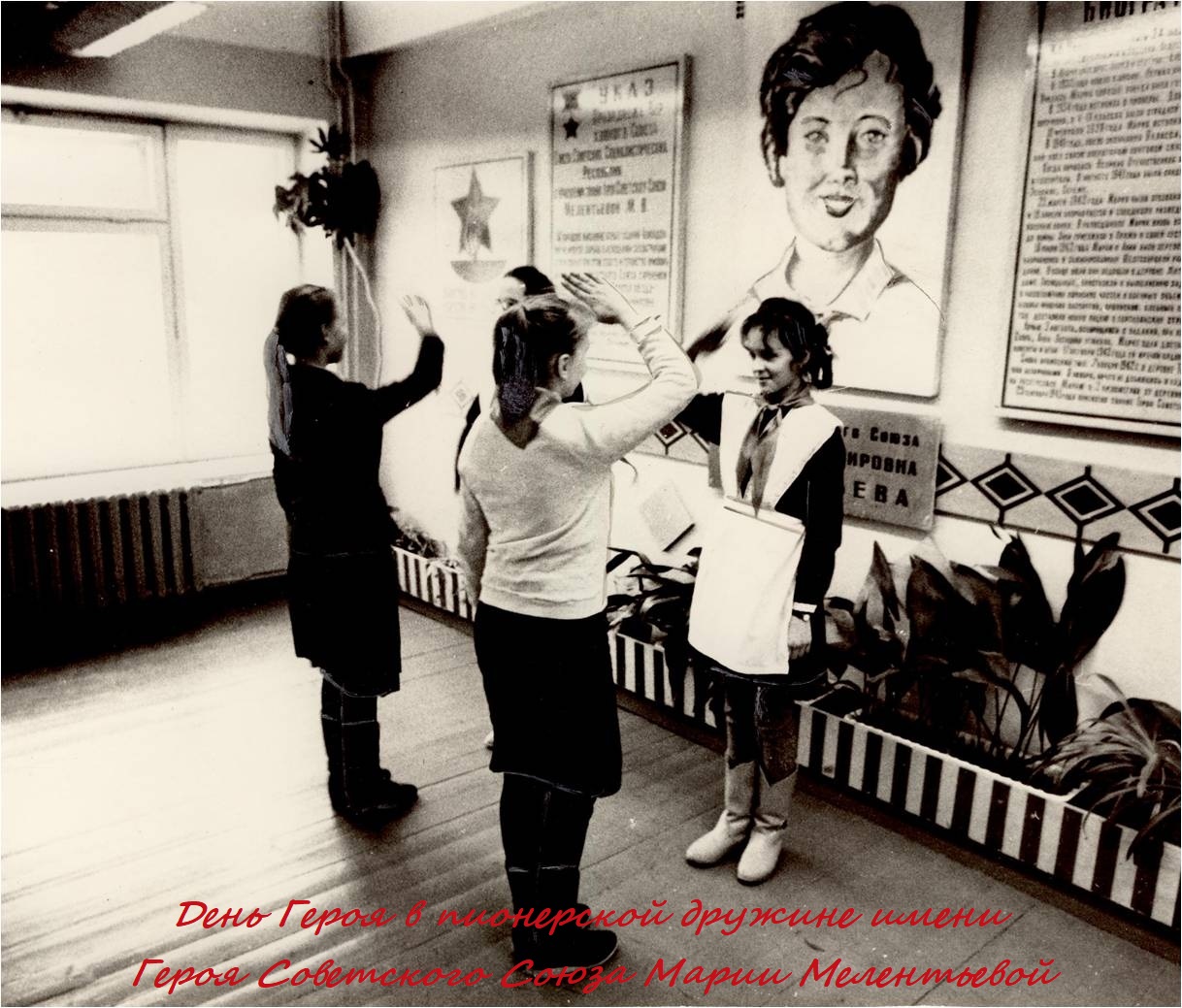 В архиве музея Боевой славы Пряжинской средней школы мы нашли интересную фотографию, с изображением портрета Марии Мелентьевой. Автором рисунка оказалась Соловьева Людмила Васильевна – удивительная женщина, ныне работающая в Музее Изобразительных Искусств Карелии. Вот что она рассказала: «В 1968 году я пришла работать в Пряжинскую среднюю школу на должность учителя рисования. Проработала в школе некоторое время, мне предложили стать старшей пионерской вожатой, и я согласилась. Девизом нашей дружины были слова: